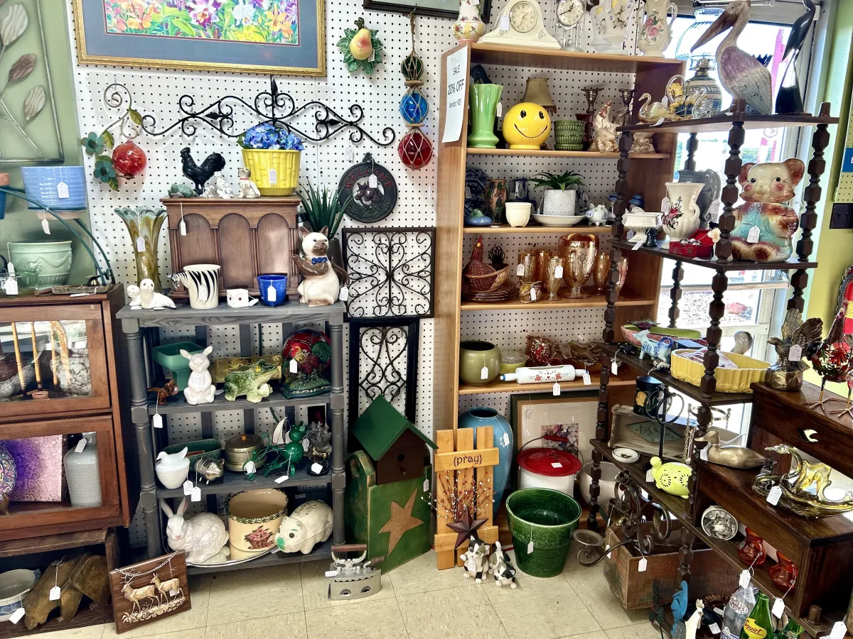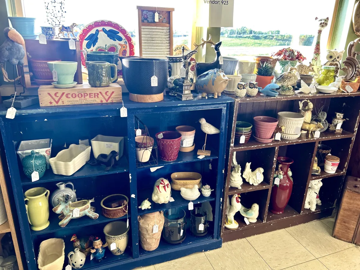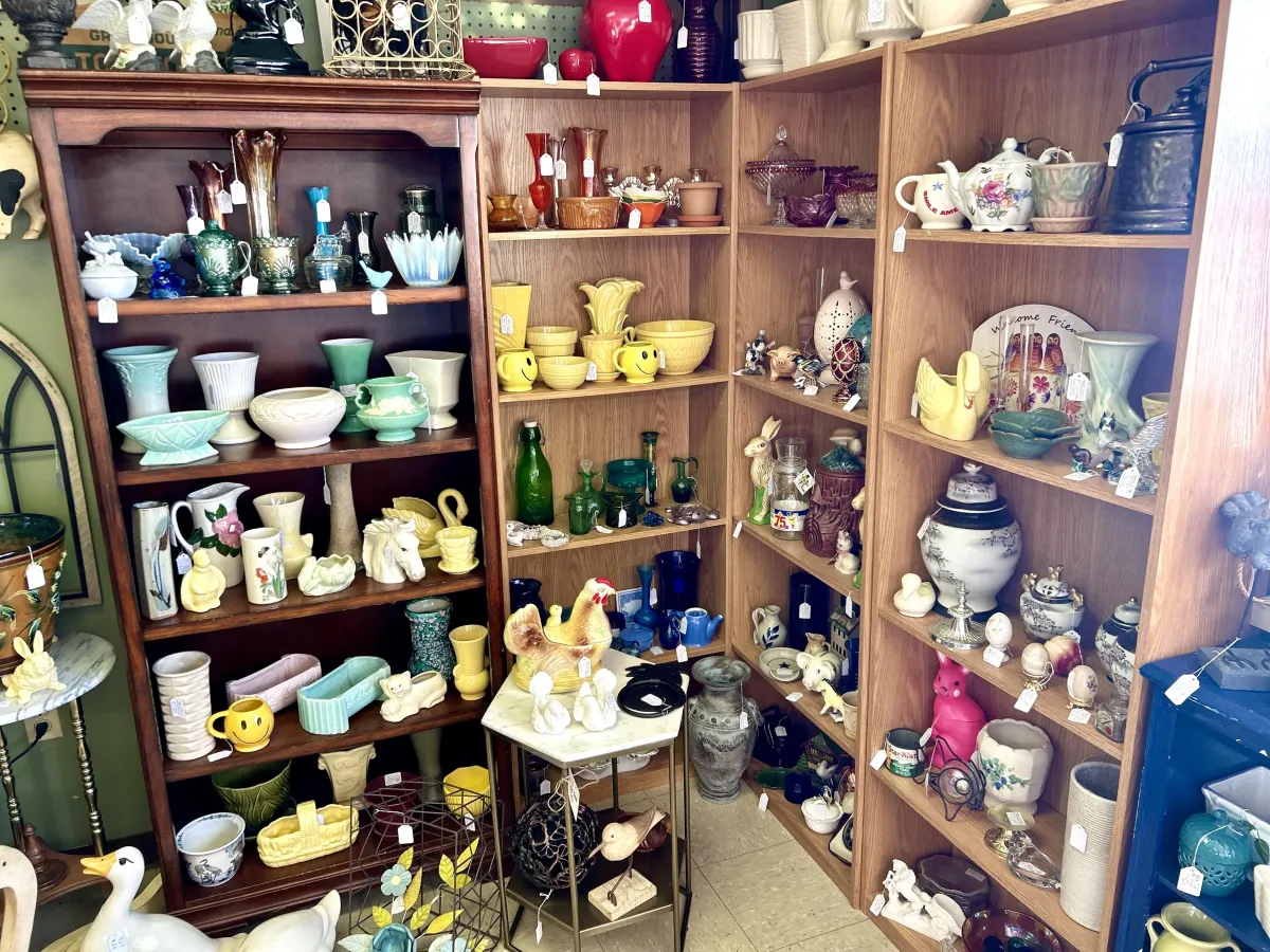We sell a large variety of glassware. Including depression, random ceramics, uranium, etc. We also specialize in Roseville pottery. We carry a nice large selection in-store. However there is much more in storage so inquire at the front desk to learn more. You can find me next to King's Cafe located in the front-right side of the building.